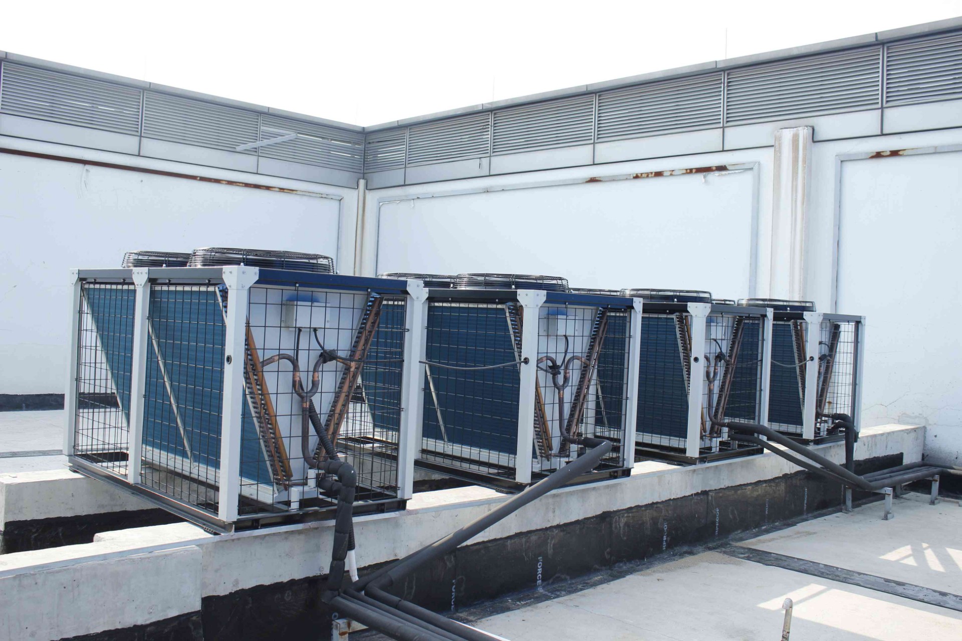 館內泳池長50米,寬25米,平均深度1.65米,采用天舒泳池除濕恒溫系統滿足泳池恒溫、室內恒溫恒濕需求。采用3臺天舒熱能五集一體泳池除濕恒溫熱泵以及4臺天舒熱能空氣源熱泵機組組成一個室內泳池系統能源解決方案來滿足泳池四季恒溫恒濕、館內春秋季全新風、冬季采暖、夏季制冷、24小時淋浴熱水的需求。3臺泳池除濕恒溫熱泵和4臺空氣源熱泵機組聯合控制,連接成一個整體,綜合利用,有力保證了系統的高效節能,降低運行費用。