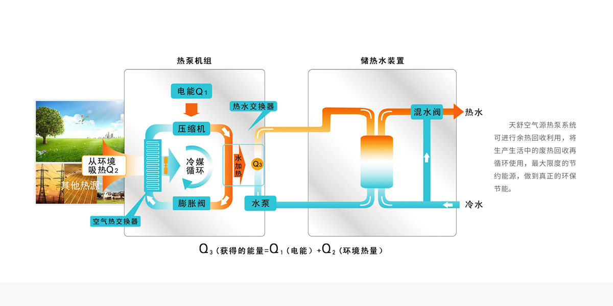 洗浴后的廢水被收集起來,回收其中的廢熱,廢水本身降至低熱溫度下被排出,收集的熱量通過熱泵再進行循環進行熱水制造。