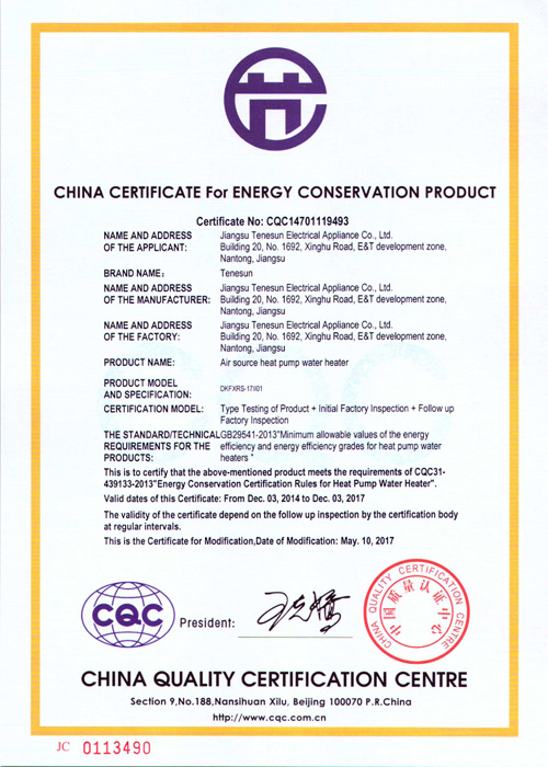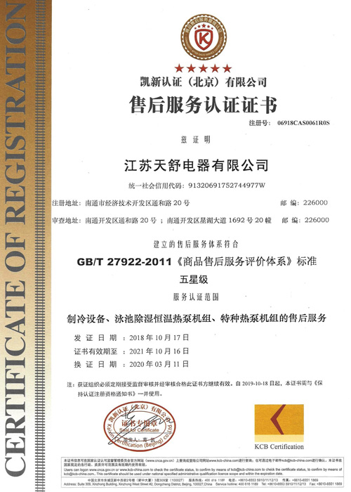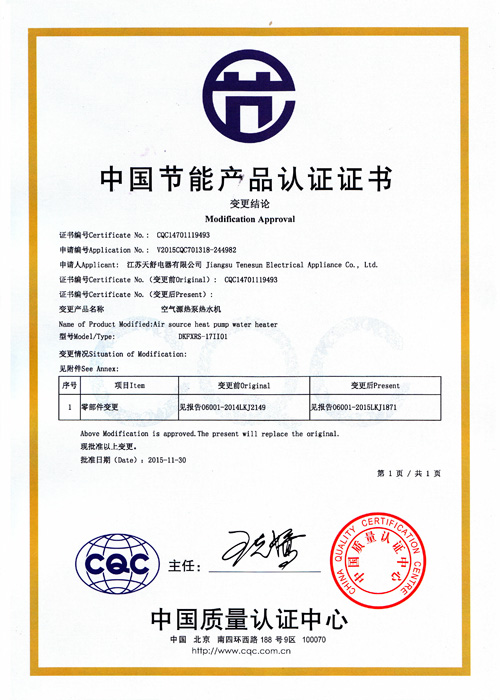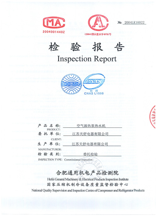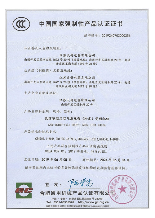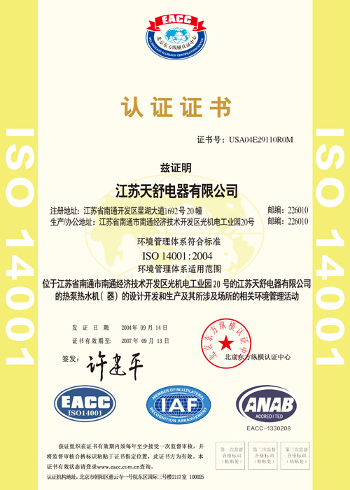 2004年10月,天舒空氣源熱泵熱水器通過國家3c強制認證,使得產(chǎn)品安全性得到全面驗證。