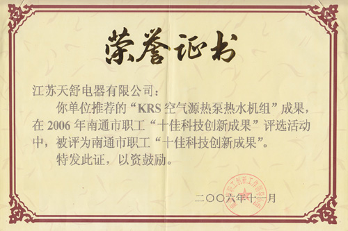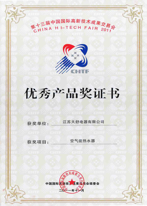 2011年11月,天舒空氣能熱水器在第十三屆中國國際高新技術成果交易會獲優(yōu)秀產(chǎn)品獎。