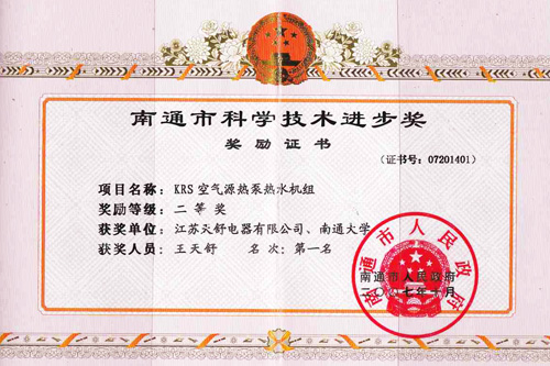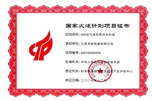 2007年12月,天舒公司KRS空氣能熱泵熱水機組榮獲國家火炬計劃項目。