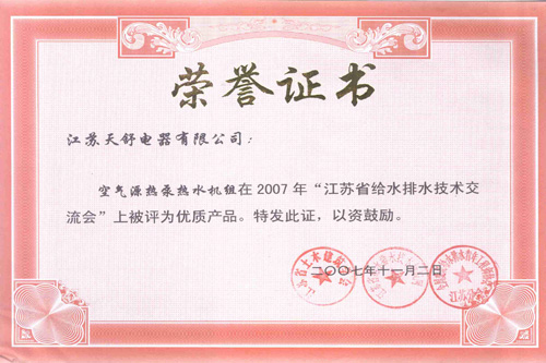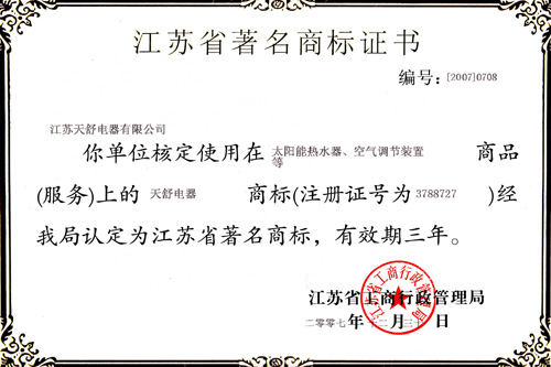 2007年11月,天舒熱能被評為著名商標。