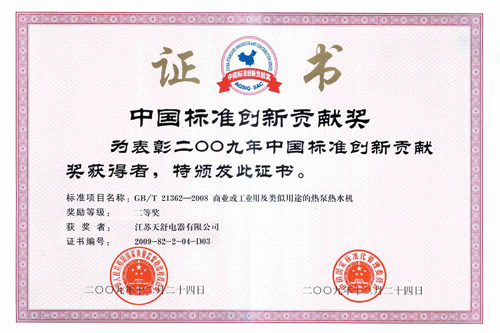 2009年12月,天舒商用熱泵熱水機獲得中國標準創(chuàng)新貢獻獎。