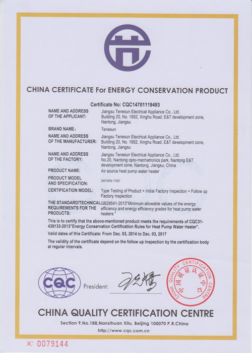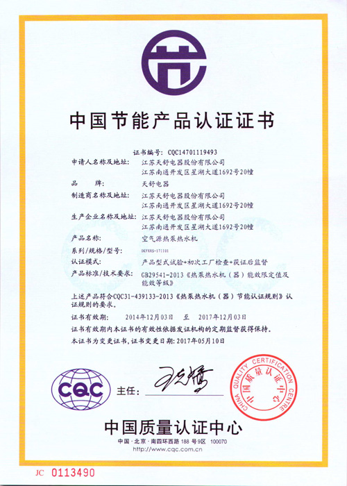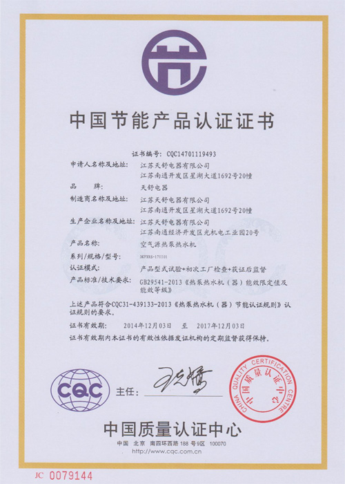 2010年9月,天舒空氣源熱泵熱水器通過中國節(jié)能產(chǎn)品認證。