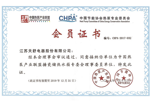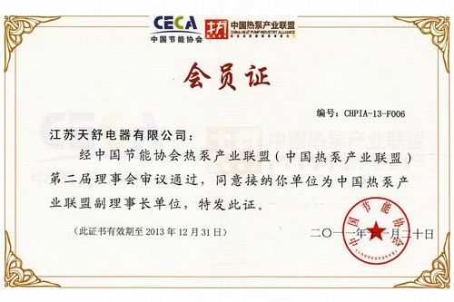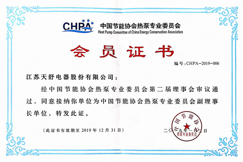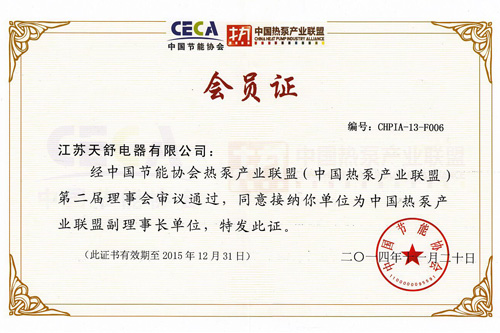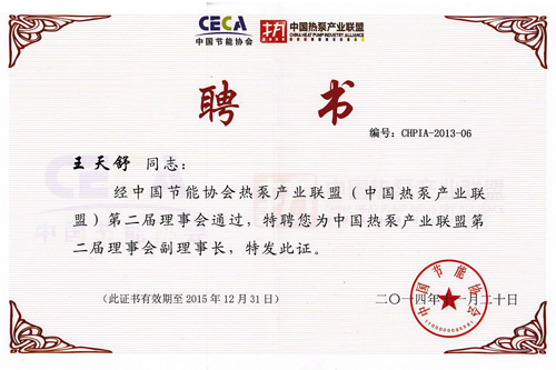 2014年08月,成為中國節(jié)能協(xié)會熱泵專業(yè)委員會副理事長單位,總經(jīng)理王天舒出任中國節(jié)能協(xié)會熱泵專業(yè)委員會第一屆理事會副理事長。