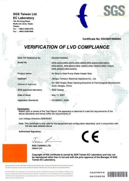 2011年12月,天舒商用熱泵通過國際標準產(chǎn)品標志認證。
