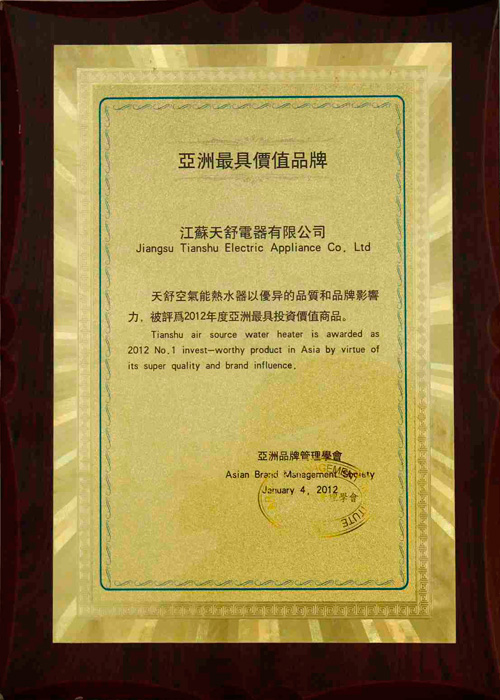 2012年4月,亞洲品牌管理學會授予江蘇天舒電器有限公司"亞洲最具價值品牌"榮譽稱號。