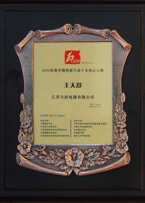 2012年10月,江蘇天舒電器有限公司董事長王天舒被評為"2012年度第五屆中國熱泵行業(yè)十大風云人物"。
