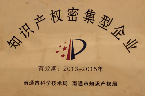 2013年4月,榮獲江蘇省企業(yè)知識產(chǎn)權戰(zhàn)略先進單位,知識產(chǎn)權密集型企業(yè)。