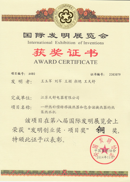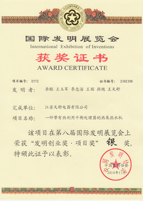 2014年11月,天舒熱泵項目(一種具有熱利用平衡處理功能的熱泵熱水機)榮獲國際發(fā)明展覽會"發(fā)明創(chuàng)業(yè)獎?項目獎"獎項。