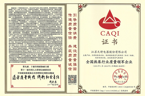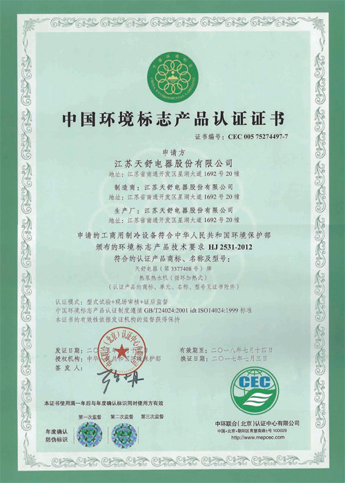 2015年07月,天舒公司獲得中國環(huán)境標準產(chǎn)品認證,成為熱泵行業(yè)第一家通過認證的企業(yè)。