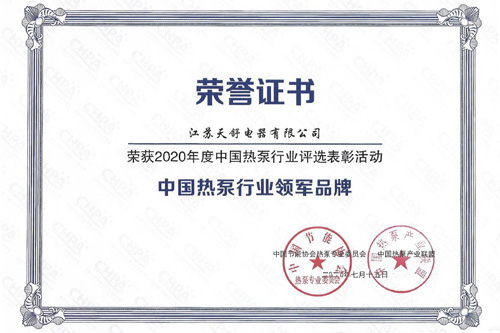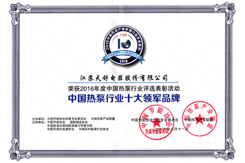 2016年8月,天舒榮獲中國熱泵行業(yè)十大領軍品牌。