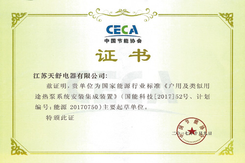 2017年10月,天舒成為國家能源行業(yè)標準《戶用及類似用途熱泵系統(tǒng)安裝集成裝置》主要起草單位。
