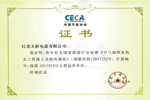 2017年10月,天舒成為國家能源行業(yè)標準《空氣源熱泵熱水工程施工及驗收規(guī)范》主要起草單位。