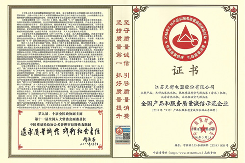 2019年 03月,天舒熱能獲"全國產(chǎn)品和服務質量誠信示范企業(yè)"榮譽稱號。