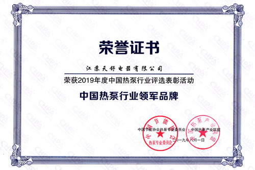 2019年07月,天舒熱能再次斬獲"行業(yè)領軍品牌"的榮譽稱號。