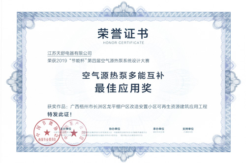 2019年07月,榮獲2019"節(jié)能杯"第四屆空氣源熱泵系統(tǒng)設計大賽"空氣源熱泵多能互補最佳應用獎"。