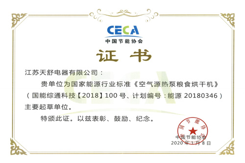 2020年01月,天舒主筆起草國家能源行業(yè)標準《空氣源熱泵糧食烘干機》。